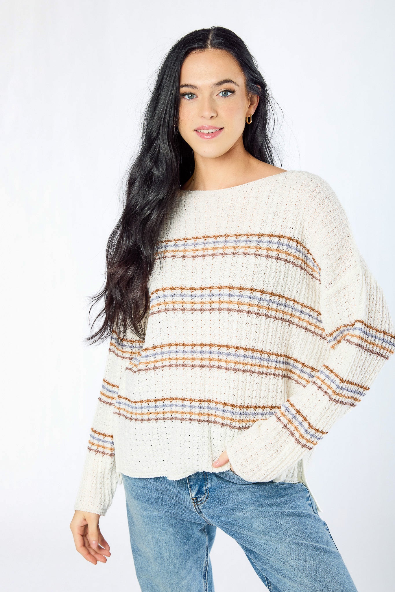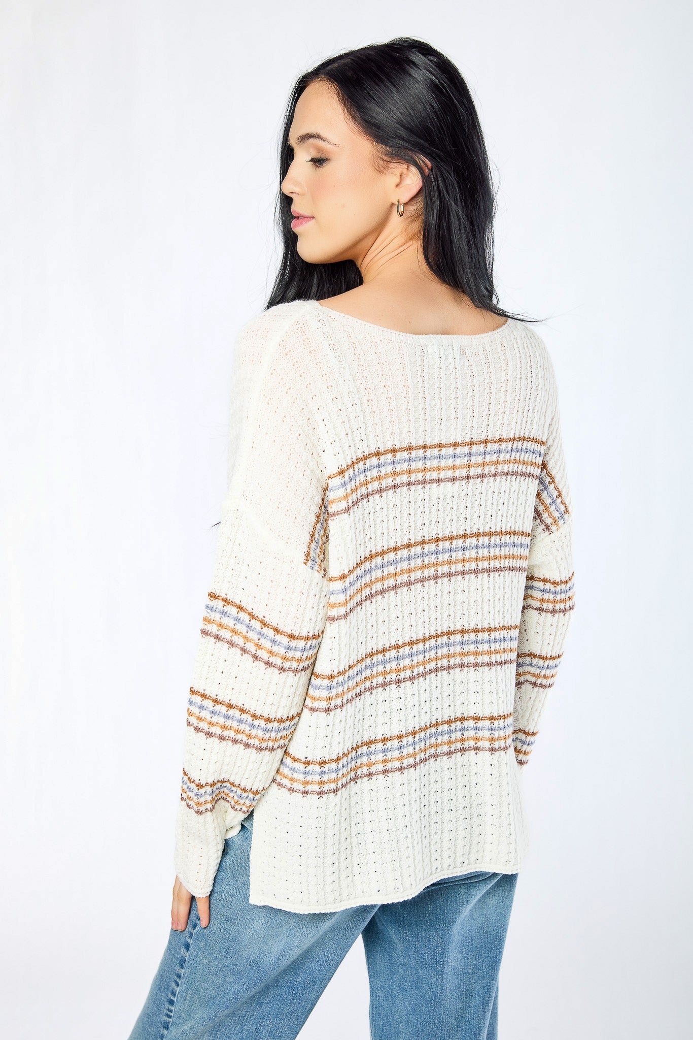 Stripe Wide-Neck Long-Sleeve Sweater with Side Slits