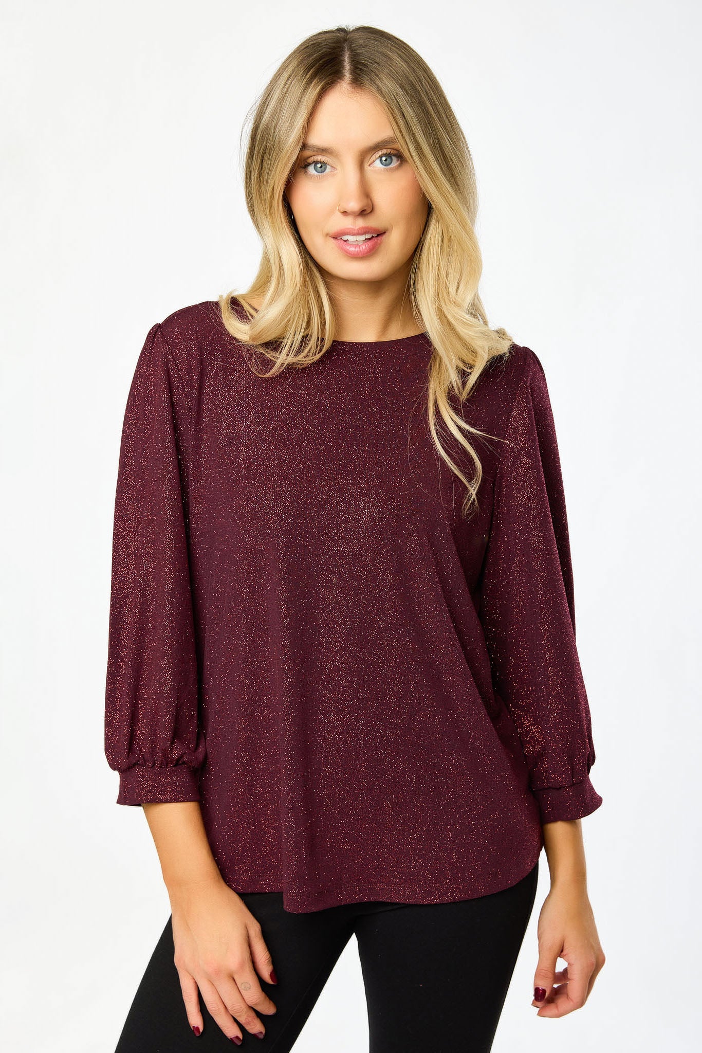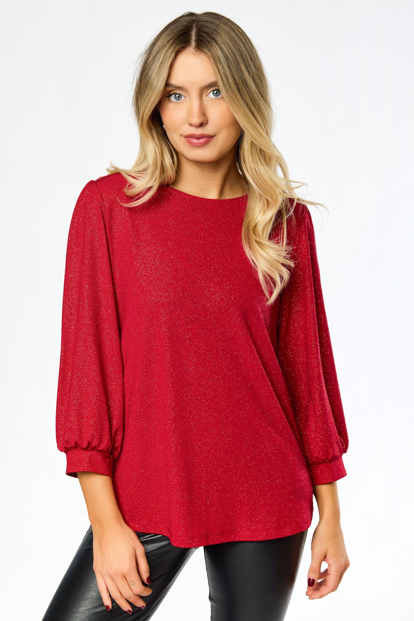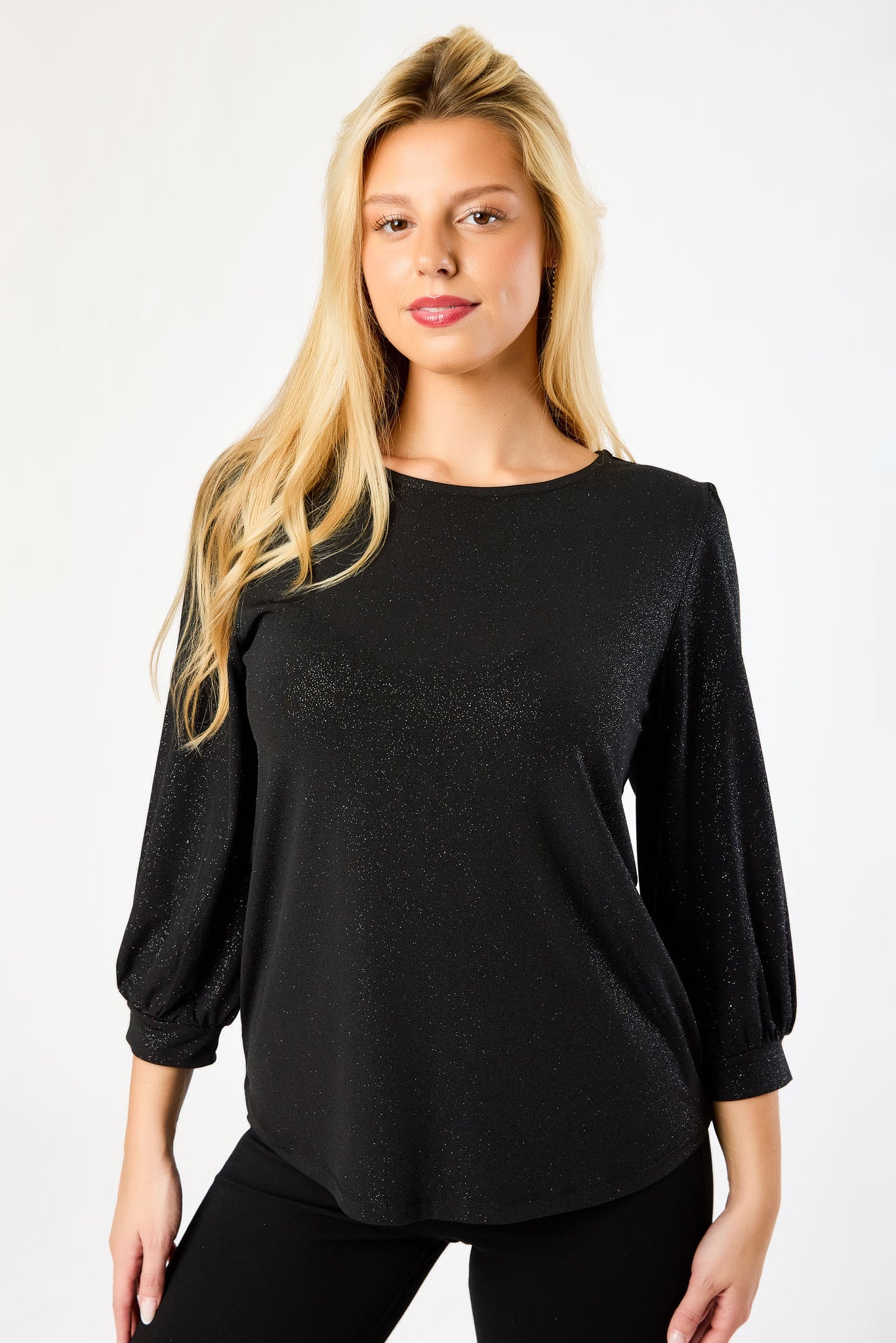 Crew-Neck Balloon 3/4 Sleeve Glitter Top with Shirttail Hem