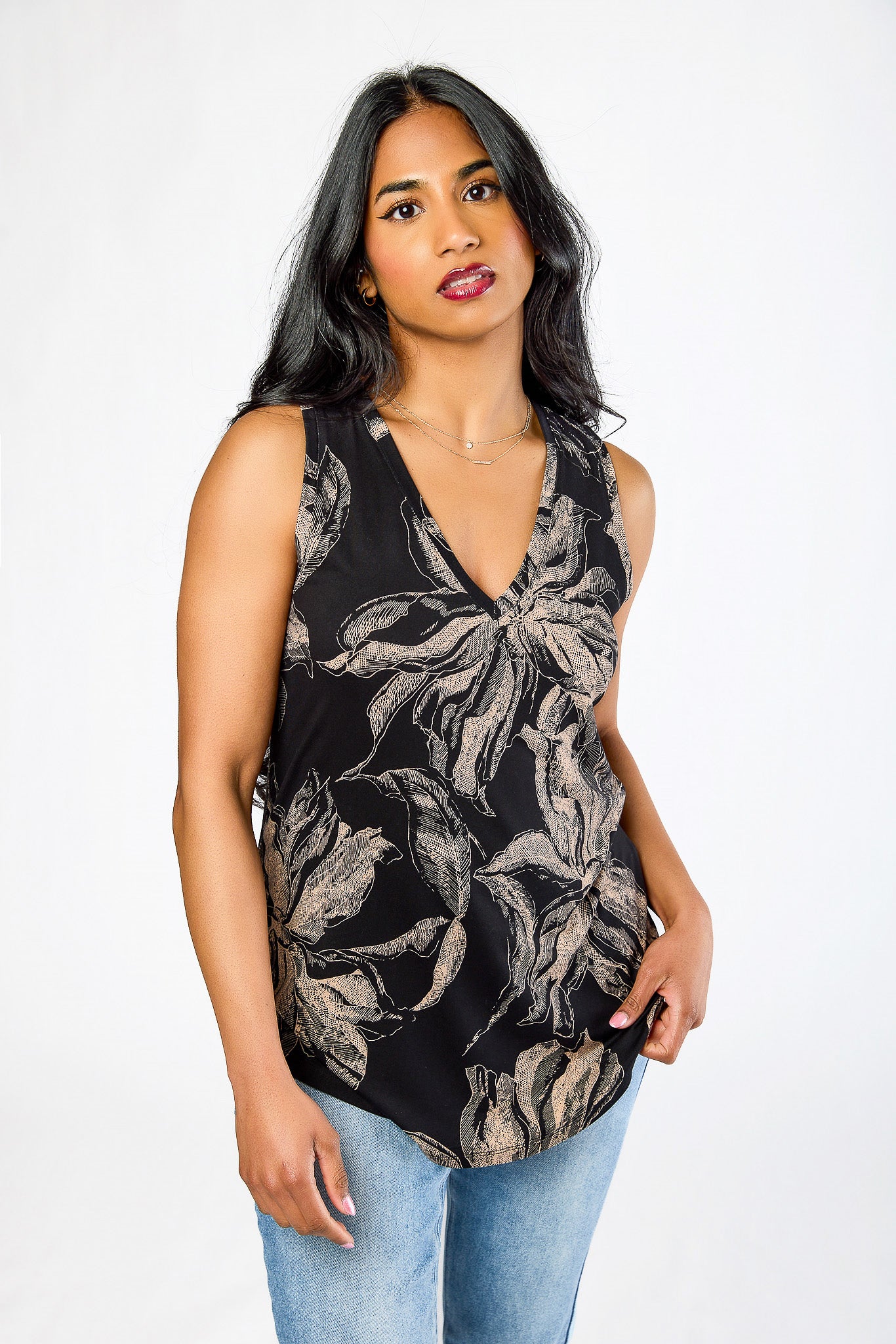 Haut floral sans manches à col en V
