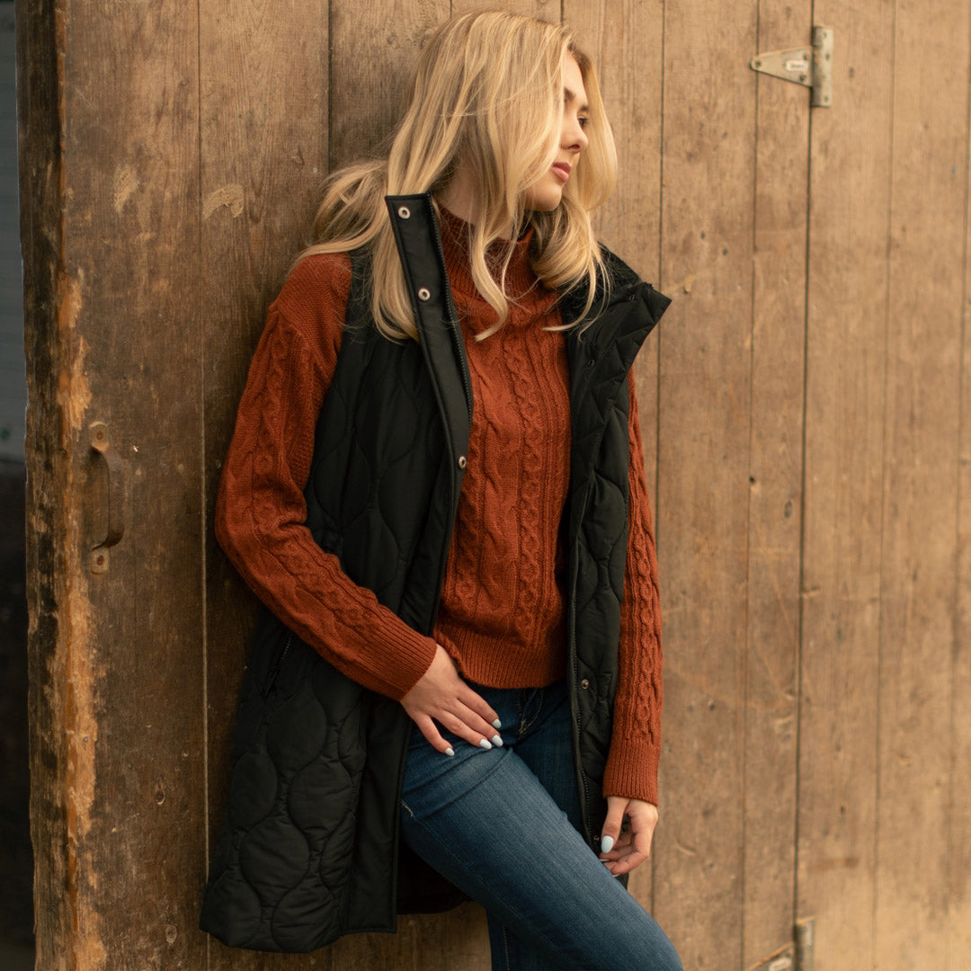 Quilted Puffer Midi Vest with Sherpa Lined Hood